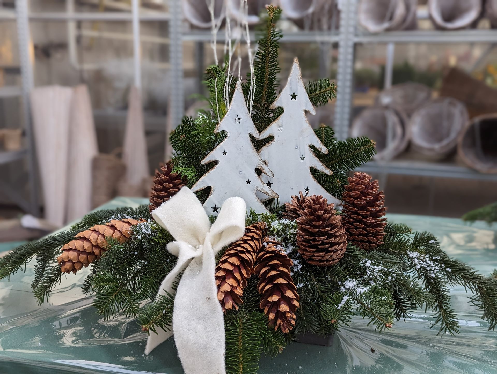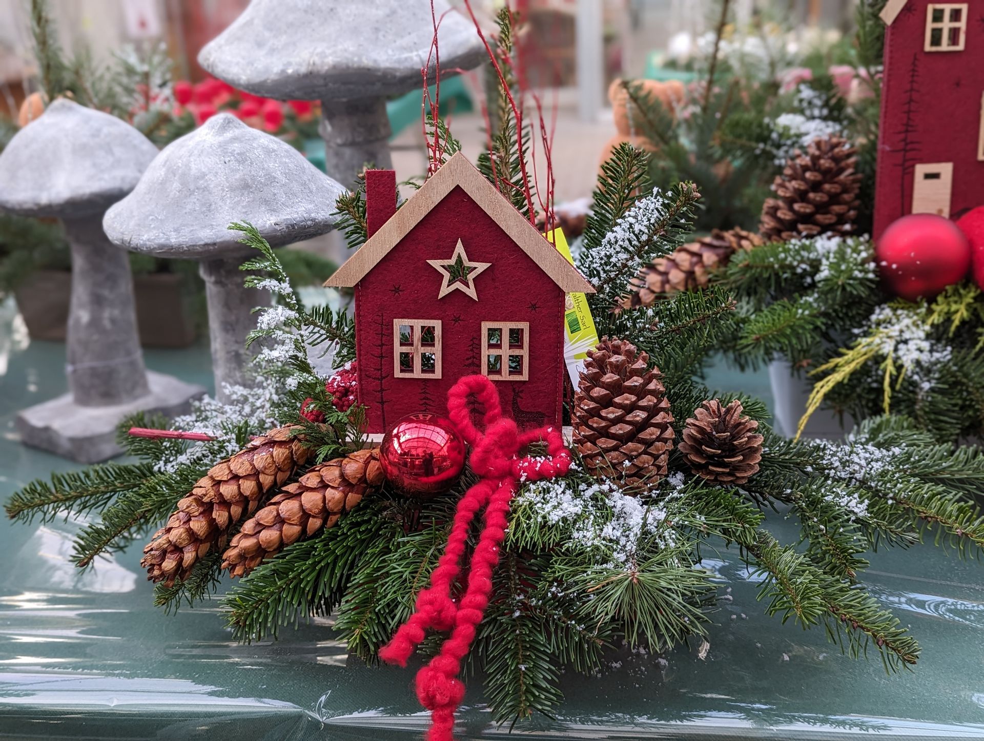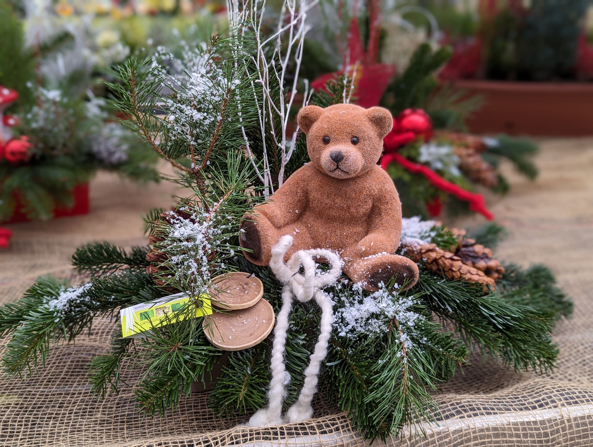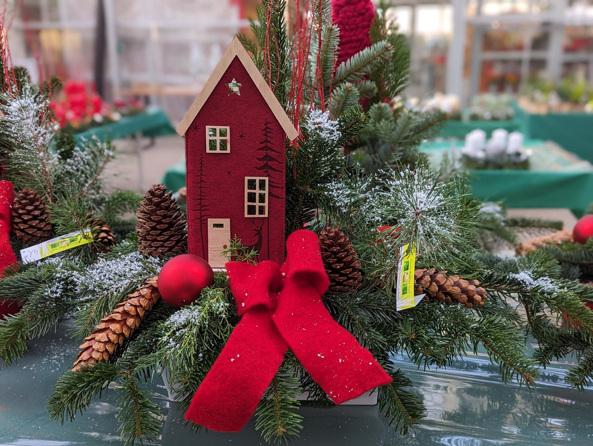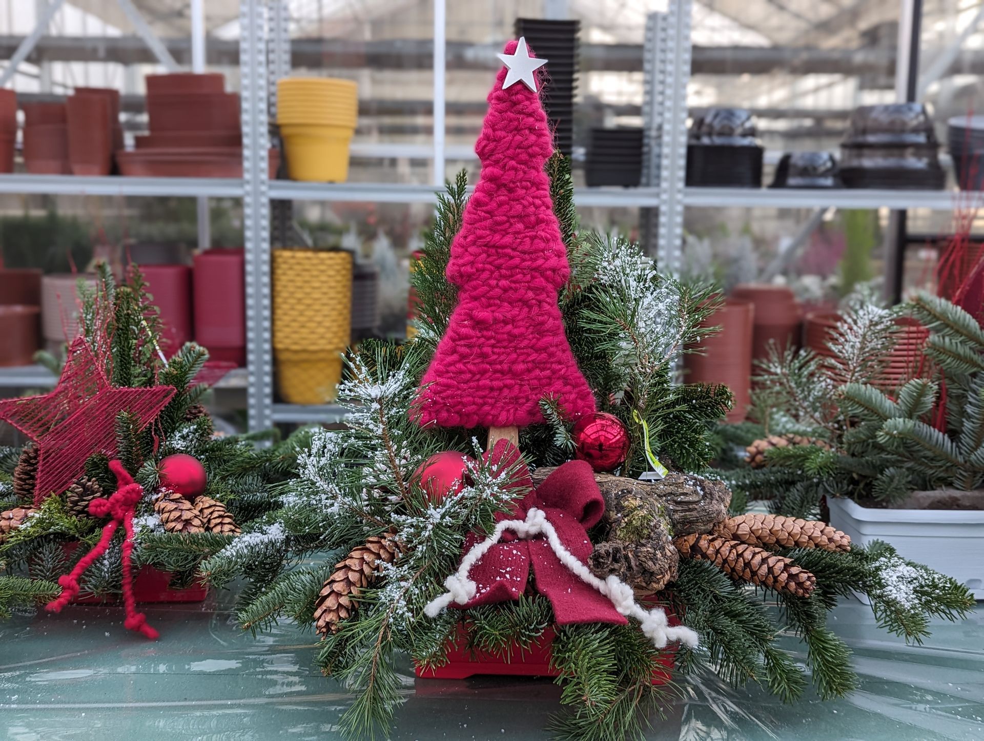 Jardinière en sapin : ton gris, blanc et rouge